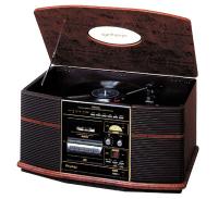 本機のアナログプレーヤー部はLPレコード(33 1/3回転)、EPレコード(45回転)、SPレコード(78回転)の3スピードに対応。回転スピードの選択もダイヤル式で簡単に行える。出力は7.5W+7.5W。2ウェイスピーカーの採用、キャビネット容量の増大などにより、アナログレコードからCDまでの高音質再生を実現する。