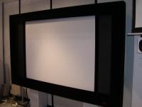 ●(株)ホームシアターのブースでは、今回が初お目見えとなるスクリーン収納シアターラックが3モデル展示されていた。「シアターラックRA」「シアターラックRB」「シアターラックRC」の3モデルで、RAが1段式、RCがフル装備のモデルになる。RBはその中間。80インチ16:9のピュアマットIIスクリーンが収納されており、視聴するときだけ引き出して使用する。