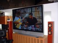 ●ビクター・ブースで真っ先に目を引くのが、61型のリアプロジェクションテレビだ。7月に北米で発売された本機は、LCOS素子とD-ILA方式を採用し、これまでにない高画質を実現している。また、これとセットで展示されていたのがウッドコーンを採用したスピーカーシステムの参考出品モデル。6月上旬に発売された「SX-WD5」が2ウェイ2ユニットタイプであるのに対し、本機はウーファーユニットを2つとし、2ウェイ3ユニット構成としている。