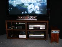 ●(株)オグラテクニカのブースでは、1本のスピーカーと1本のサブウーファーによるフロントサラウンドシステムが提案されていた。