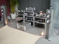 また、「昨日入ってきたばかり」というのが、Birdland AudioのDACプリアンプ「ODEON-Platinum」。前面のクリアパネルはライトアップされ、次々に色が変わる。ライトアップの色は20色程度という。i.Linkも2系統装備しているとのこと。価格は100万円程度になりそうだが、詳細は未定。同社からのアナウンスを待ちたい。