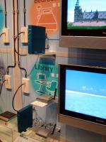 もう一つ画期的な技術と言えるのが、同軸ケーブルを使ったホームネットワーク「c.LINK」だ。これは、テレビ用の同軸ケーブルでデータ通信を行う技術で、アダプターを噛ませるだけで、高速なホームネットワークが完成する。現在、「Moca」という団体で規格策定が行われており、今年末には製品の認定が開始される。松下では、2005年度以降にアダプターの製品化を予定している。アダプターは前回の「ケーブルテレビ2004」に出展されていた時よりも格段に小型化が進んでおり、将来はテレビの中に内蔵することも可能という。会場では、AVCサーバーから20MbpsのHD映像を3本同時に配信し、それを同軸ケーブルを介してつながった3台のテレビで再生する、というデモが行われていた。
