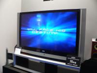 ビクターのブースでは、HD-ILAデバイス採用リアプロジェクションテレビを展示。今回はA&Vフェスタなどでも出品されていた、既に北米で発売されている61V型よりも、さらに一回り大きい70V型の製品が展示されていた。国内で売られているプラズマ・液晶テレビと比べると階調は浅く、また巨大なサイズにハーフHDとなるため近くで見ると多少のドット感はあるものの、その大画面は何よりの魅力だろう。なお、各モデル国内投入については、出荷量と価格の問題から検討中としている。