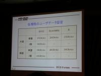 HD DVDの各メディア規格ごとに、現時点で取り決められているユーザーデータ容量も発表された。これによると、HD DVD-ROMの片面・単層ディスクは15GB、両面二層のディスクは60GBの容量を備えるディスクが検討されており、書換型、追記型のディスクともに大容量の高品位コンテンツを記録することが可能な仕様となっている。現在検討されている各規格の仕様一覧も紹介された。詳細は以下の写真でご確認頂きたい。