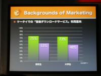 サービスの内容については、同社コンテンツ・メディア本部長の高橋誠氏よりプレゼンテーションが行われた。高橋氏は、同サービスを開始する背景として、WIN端末所持者とダブル定額サービス利用者のうち、10代から20代の若年層がいずれも50%以上を占めているとし、「高校生、大学生に携帯での音楽ダウンロードサービスについて利用意向を聞いたところ、男性では70%以上、女性でも50%程度が使いたいと回答した」と述べた。