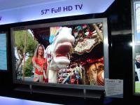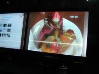 その隣のサムスン電子のブースは液晶ディスプレイを中心に展示。豊富な画面サイズを取りそろえ、携帯電話用からテレビ向け57インチのフルHDタイプまで、ラインナップの充実度では他ブースを圧倒している。