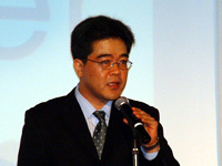 初めにキム氏が同社製品の市場動向について説明を行った。本年の同社のデジタルオーディオプレーヤー製品の売り上げ見込みは300万台。全世界の見込み2,200万台のうち15%のシェアを獲得していると説明。また、HDD非搭載のフラッシュメモリータイプではトップレベルのシェアを獲得していると強調した。2005年度の売り上げ目標は本年度の2倍の700万台。「コンテンツとハードの融合」を目指し、様々なパートナーと協同してさらなる成長を遂げたいと語った。
