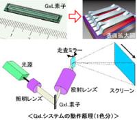 “GxL”は光回折格子を用いたレーザープロジェクション方式のディスプレイ技術。“GxL”素子は、半導体技術を用いて製造される光回折格子型のMEMS(Micro Electro Mechanical Systems)素子で、素子の表面に配された微細なリボンを電気信号で動かすことで、光源のレーザーから発せられた光の回折光の強弱を制御し、映像化する。