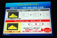 「フレームクリエーション」は、同社独自の動きベクトル解析技術を用い、前後の映像フレーム(コマ)から新たに映像コマを作成・補間することで、動画残像の原因となるホールド時間を短くし、残像を低減する技術。映像コマはこれまでの秒間60コマから90コマに増やし、ホールド時間を約30%短縮して1/90秒(約11.1ミリ秒)と短くする。