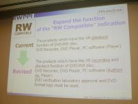 「RWコンパチブル」表示の仕様規約変更に関する提案も、森下氏より本会議において提案された。現在の「RWコンパチブル」マークは、VR記録されたDVD-RWの再生に対応する機器のみに適用されてきた。今後はDVD-RWのVR記録、または再生が可能な機能に対してコンパチブル表示を行うよう規約を変更する案件が提案された。またPCアプリケーションについても、再生ソフトだけでなくDVDオーサリングソフトへも適用範囲が広げられる見込みだ。今回の提案により、今後RWコンパチブル表示の仕様規約変更の手続きがRWPPIにより進められることとなった。