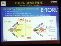 いずれも、投射方式は3板液晶パネル「3LCD」方式を採用。光源ランプには、自社開発の「E-TORL(Epson-Twin Optimize Reflection Lamp:多重反射式高効率ランプ)」を新規採用した。E-TORLランプは、リフレクターに反射させて前面に投射する仕組みの従来型ランプに、発光管を半面覆うもう1枚のリフレクターと、非球面レンズを組み合わせて使用したもので、ランプの小型化と、高い光利用効率を両立することができる。