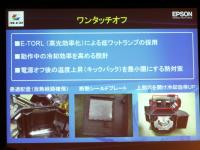 光利用効率が高いE-TORLランプを使用することで、電力消費を抑えながら明るさを高めることができ、これが本体の発熱を抑えることにもつながる。このほか、本体内部の放熱方法を工夫することなどにより、電源をオフしたあとのクールダウンを無くすことに成功した。他社製品では、長いもので90秒程度のクールダウンが必要となっており、エプソン販売ではこの本機の特徴を大きくアピールする考えだ。
