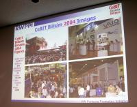 続いてRWPPI事務局の森下氏により、先に行われたCeBIT ASIA 2005の出展活動報告が行われた。433社が出展し、約53,300人の来場者を獲得したという大規模なイベントにおいて、RWPPIはブース出展を行い、新たなテクノロジーやハード・メディアの新製品を展示した。来場者に向けて、デモンストレーション展示も積極的に行いDVD-R/DVD-RWの特徴である「Compatible・Convenient・Reliable」をダイレクトに訴求した結果、中国国内の研究・開発者や若い学生をはじめとした、多くの来場者にフォーマットの優位性を伝えることができたと森下氏は語る。