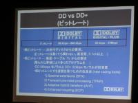 現行DDとDD+の違いとしては、まずビットレートが挙げられる。現行DDは96kbps-640kbps、DD+は32kbps-6Mbpsと大幅に拡張されている。高ビットレートは次世代ディスクからの要求で、高音質かつ5.1ch以上が望まれた結果である。一方で低ビットレートにも対応しており、これは衛星・ケーブルテレビからの要求によるもの。しかしながら低ビットレートでも音質を保つ改良が施されている。これは昨年秋にAESのコンベンションで開示されたホワイトペーパーに詳細が記されているという。