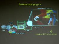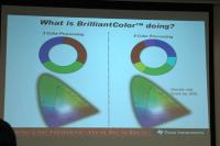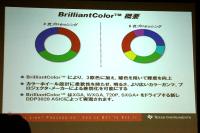 BrilliantColorテクノロジーは、3〜6色までのカラーホイールに対応したカラー処理技術。イメージングASIC(集積回路)「DDP3020」で実現する本技術は、新しい色彩処理アルゴリズムとシステム・レベルのカラー信号画質向上処理により、画像の色彩表現と輝度の向上を実現している。具体的には、色域が拡大したほか、中間域の輝度が50%程度向上しているという。
