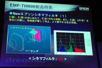 プロジェクター部は今年春に発売した「EMP-TW20」と同等で、画質もTW20に準じる。液晶パネルは854×480画素の16対9ワイド。明るさは1200ルーメン、コントラスト比は1000対1。ランプは、リフレクターを工夫することにより光効率を高めた「E-TORL(Epson-Twin Optimize Reflection Lamp」を搭載。このランプにより高輝度を実現したほか、映像の色域を拡張し、正確な色再現も可能になる。