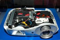 「E-TORL」ランプは、TWD1の項で紹介したもの。前モデルのTW200Hと比較すると、明るさは1500ルーメンから1600ルーメンへ向上した一方、ランプはE-TORLの採用により200Wから170Wへと出力を下げ、輝度効率(ルーメン/W)は7.5から9.5に上がった。ランプ出力が下がったことで発熱も抑えられることから、低騒音化にも寄与するという。ちなみに本機の騒音は26dBで、1ヶ所の吸気口から、主要部分にそれぞれ専用ダクトで風を送り、冷却効率を高めたことも効果を発揮している。