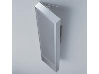 本機ではスピーカーユニットそのものの薄型化を実現した。新開発のスピーカーユニットでは、強力なネオジウムマグネットの同極同士を向かい合わせることで、磁束を外周に向かって放出させ、そこにボイスコイルを設置する反発磁気回路方式を採用。振動板も、ボイスコイルのボビン中央と接続。立体構造を平面構造へと変革することで、3cmの薄型ながら、高音質を実現している。スピーカーは壁掛け設置でも角度調節が可能。