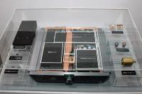 薄さを追求するディスプレイにあわせてスピーカーも薄型化を、という考えの基に開発された「1ビットアンプ高効率コンデンサースピーカー」も展示を行う。静電気を利用して振動板を駆動する方式を利用した同スピーカーの音は、実際に体験することが可能だ。
