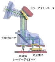 「超小型光無線モジュール」は、0.1゜以下の拡がりのレーザービーム光を通信に用いた高効率伝送と、光学部品の高精度実装技術などにより実現した。