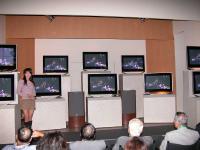 今回の比較展示では「黒の表現力」「フォーカスの鋭さ」などのSEDの優れた性能を、CRTテレビと並べた画質比較デモで紹介している。SED試作機の画面サイズは36インチで、430カンデラの明るさ、約100,000対1のコントラスト比を実現している。比較視聴のデモコンテンツには、HDクオリティの動画と静止画、またHDカムで撮影したライブ映像が使われている。今回、CRTテレビとの比較展示を行った背景について、展示解説員は「発光原理の同じCRTを基準としても、より優れた映像を実現できるSEDのポテンシャルを確認してもらうため」と説明する。