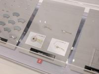 ハードディスク関連の最新技術としては、トンネル磁気抵抗(TMR:Tunneling MagnetoResistive)再生素子と垂直磁気記録(PMR:Rerpendicular Magnetic Recording)素子とを組み合わせたハードディスク用ヘッドを紹介。ディスクリートトラック型の記録媒体と合わせて、1.8インチのハードディスクで約100GBの大容量記録を実現する先進ヘッド技術、および記録媒体技術を紹介している。また同じ一角ではSV-GMR素子とマグネットを使用した、世界最小のハードディスク用3軸落下センサーを展示している。