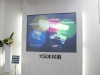 大日本印刷のブースには同社が新しく開発したスクリーンが展示され注目を集めている。ブース正面には独自開発の素材を用いて明るい部屋でも高精細な大画面映像を実現する外光吸収スクリーンのハードボードタイプを展示する。またインタラクティブ機能を実装した透明タイプのスクリーンも展示されている。