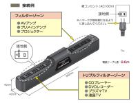 ノイズ減衰量-35dB以上(2.5〜100MHz)のフィルターゾーン、-20dB以上(2.5〜100MHz)のラインゾーンからなる本機は、AT-NF517同様に、機器ごとにセパレート接続することで効果的なノイズ低減を実現。また同様に、難燃性&自己消火性樹脂、耐10,000Aのサージノイズフィルターを搭載している。