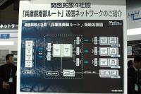 東芝のブースで目を引いたのが兵庫県に矢印が入った地図。これは地デジの中継システムの概要を示したもので、現在稼働中の生駒送信所からの放送信号を4箇所の中継局に送信するシステムだ。摩那固定局からの信号は、北淡垂水局、姫路局、三木局へはマイクロ波中継、神戸局へは光ケーブルによる中継が行われる。同社が提供した同システムは年内に稼働する予定だという。