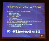 Viivテクノロジーが搭載されたPCでは、「家電並みの使いやすさ」や一層の処理速度向上、筐体の小型化が可能になるという。注目されるスペックのひとつとしては、「インテル クイック・レジューム・テクノロジー」により、PCをキーボードやマウスに頼ることなく「リモコン」で家電機器のように遠隔操作できたり、瞬時に電源をオン/オフする機能が実現される。また、PCをオンにしながらディスプレイ・サウンドはオフにする「ビジュアル・オフモード」も搭載され、複数のユーザーでひとつのPCに保存したコンテンツにアクセスする場合に使い勝手がよりいっそう高まるというものだ。