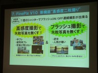 そして、最大の特長となるのが、一度シャッターを押すだけで、ノンフラッシュ撮影とフラッシュ撮影の2枚を連続して撮影できる「高感度2枚撮り」機能の搭載だ。「高感度シリーズでは、高感度を活かしてフラッシュをたかないことで、自然な表情や暗い場所でも背景まできれいに撮影できる素晴らしさが高い評価を集めた。V10で撮れば、失敗することがさらになくなる」(小島氏)と語り、今後発売する高感度シリーズには、この機能を随時搭載していく方針だ。