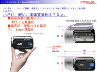 【SPEC】●HDD:20GB ●撮像素子:1/3.9型218万画素CCD ●有効画素数:123万画素(動画時)、200万画素(静止画時) ●レンズ:光学10倍ズーム(デジタル200倍ズーム) ●最低照度:15ルクス ●液晶モニター:2.7型カラーワイド液晶モニター ●入出力端子:USBミニ、S端子出力、AV出力 ●消費電力:4.6W ●外形寸法:68W×69H×109Dmm ●質量:約370g(本体)、約430g(撮影時)