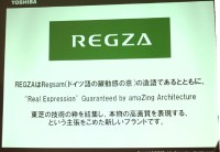 「REGZA」は、Regsam(ドイツ語で躍動感の意)をもとにした造語で、「“Real Expression”Guaranteed by amaZing Architecture=東芝の技術の粋を結集し、本物の高画質を表現する」という意味が込められているという。コンセプトカラーとして「レグザ・グリーン」を定義し、自然のイメージや精神的な深さ、安心感や信頼感を表現する。