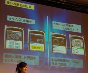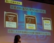 また総会の後半では、TBSの竹内香苗アナウンサーと、同局でワンセグ編集長を務める清水氏が登壇。TBSが現在検討しているワンセグのデータ放送サービス案が紹介された。災害情報の配信、番組内で紹介したプレゼントへの応募、クイズへの参加のほか、レシピ情報などの携帯電話への保存、着メロや着うたのダウンロード、番組へのメッセージ送信などの具体的なサービス例が明らかにされた。