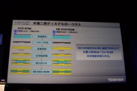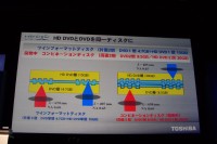 まず多層化技術については、「当初、BDは2層で50GBができると盛んに喧伝していたが、最近ではあまり聞かなくなった。0.1mmのコーティング層しか持たないBDより、0.6mmのHD DVDの方がはるかに多層化は簡単。BD陣営は50GB、100GB、200GBのディスクがいつ実用化するか説明する責任があるのではないか。HD DVDは現状で30GBの2層ディスクを実用化しており、現段階では30GBのHD DVDと25GBのBDでは、高容量なのはHD DVDということになる。技術的な意味でも、DVDに近い物理仕様で高容量記録を実現するため、BDよりはるかに多くの技術革新を行っている」と強く主張した。