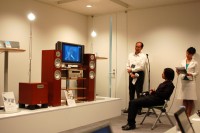 また最後に、「本格ホームシアターで楽しむスタイル」として3月下旬発売のAVアンプ「DSP-AX759(→発表時のニュース)」によるiPodの活用方をアピールした。専用Dockを使うことで、iPod内の音楽の再生だけでなく、映像をテレビ画面に出力できると紹介し、デモを行った。