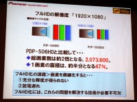 また佐久間氏は、フルHDを実現することの難しさについても言及。「昨年モデルのPDP-506HDと比較すると、総画素数は約2倍の2,073,600画素となっているが、1画素の面積は約半分の47%となる。画素を微細化すると、輝度が十分に得られない、放電が遅れるなどの問題が起きる」と説明した。