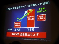 井原氏は始めに「昨年上期はソニーのエレクトロニクスが大変な状況に陥ってしまい、とりわけテレビ事業が全体の足を大きく引っ張ってしまった」と述べ、新社長の中鉢氏を中心とした新たな体制のもと、「テレビの復活なくしてソニーの復活はない」という言葉を合い言葉に、05年末より新ブランドのテレビ「BRAVIA」シリーズを投入した経緯を説明。その結果、「全世界でブランドイメージの強化を図り、ソニーのテレビの地位向上を実現することができた」と語った。実際に販売実績を見ても、BRAVIA投入前の上半期には全世界で9%のシェアにとどまっていたソニーのテレビが、投入後の下半期には19%まで拡大している。井原氏は、「長期安定的なポジションが獲得できるまで、今後も気を抜かずに頑張っていきたい」と率直に抱負を述べた。