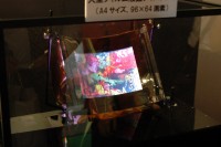薄くて軽く、丸めて持ち運びができるディスプレイ。インクジェット法でRGBの燐光材料を基盤に付着させた「フレキシブル有機ELディスプレイ」の試作品は5インチ、128(RGB)×72の解像度を実現している。また、昨年の技研公開にも出品されたA4サイズの「フレキシブルフィルム液晶ディスプレイ」も展示。96×64の画素数はそのままだがコントラストを改善したのだという。