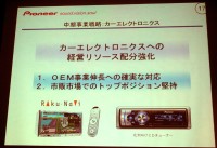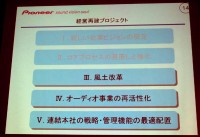 個々の事業の戦略では、まずカーエレクトロニクス事業に経営資源を重点的に配分し、強化する計画が示された。「全社から人的リソースを集め、OEM事業を強化するとともに、市販市場でのトップポジションを堅持することが重要」と説明。「カーエレクトロニクスは、パイオニアの経営安定を高めるため、絶対的に重要な事業だ」と強調した。