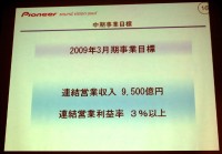 続いて須藤社長は、2009年3月期の事業目標を発表。連結営業収入は9,500億円、営業利益率は3%以上を目標に掲げ、「これを達成するためには、ホームエレクトロニクス分野の収益を早期にブレークイーブン化するとともに、カーエレクトロニクス分野の営業利益率を7%以上にすることが必要だ」と説明した。