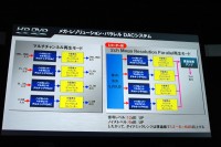 映像回路部は、アンカー・ベイ・テクノロジーズ社製のスケーラーを搭載することで1080pアップコンバートに対応。1080iのハイビジョン放送やDVDなどのSD映像を1080pにアップコンバートしてHDMI出力することが可能だ。なお、本機のHDMI端子は、同社説明員によると「バージョン1.3相当」になっているという。これにより、色信号のビット拡張も実現しているようだ。ただし、前述の通り、ドルビーTrueHDやDTS-HDなど、次世代オーディオフォーマットをHDMIから出力することはできない。またアナログビデオ出力には、アナログ・デバイセズ社製の297MHz/14bitビデオエンコーダーを世界で初めて搭載し、大幅なノイズ低減を実現している。