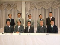 | 会見を行った富士フイルムイメージングの新首脳陣。前列中央が代表取締役社長・杉原和朗氏、その右が執行役員・四宮啓司氏、左が執行役員・小島正彦氏 |