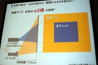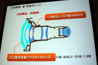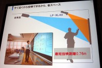 “超・短焦点レンズ”は、同社が従来採用してきたレンズ11枚による構成に新たに大口径の非球面プラスチックレンズ2枚を追加した新開発のレンズ。同社の現行短焦点レンズでは、103cmの距離からの投写で41インチの画面サイズが最大なのに対し、本機では80インチの画面表示が可能だ。また、60インチの表示の場合、投写距離は76cmという短距離を実現している。