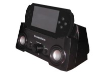 PSP対応の音声/電源一体型ケーブルを同梱再生機器とは3.5mmステレオミニ端子で接続するため、様々なゲーム機やオーディオ機器で利用できるが、本体上部にPSPを収納できるほか、PSP対応の音声/電源一体型ケーブルを同梱するなど、PSPとの組み合わせに最適な仕様となっている。