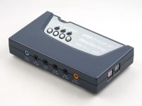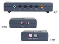 本機は12x7cmという、手のひらサイズの筐体に豊富な音声入出力装備する。USBは1.1対応。入出力は光デジタル(入力×1、出力×1)、ライン入力×1、マイク入力×2、ヘッドフォン出力×1、7.1chアナログ出力×1を搭載。ドルビーデジタルを光端子からパススルー出力することができるほか、SAMS(Serial Copy Management System)に対応する。