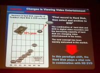 藤井氏はさらに、現在東芝がハードディスクや光記録ディスク等の記録媒体から、高性能プロセッサー「Cell」、液晶ディスプレイのデバイス等、広範な次世代エンターテインメントに関連するコア技術や製品に関わり、大きな影響力を発揮している企業であると述べた。中でもハードディスクと光記録ディスクの技術においては業界のリーディングポジションにあることを強調しながら、日本国内では「HDD搭載HD DVD録画機」のビジネスに力を入れて取り組んでいることを紹介した。