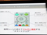 リモコンは新開発の「スマートリモコン」を同梱。ボタンの数を従来の67キーから22キーに減らした。要注目なのが“スマートジョグ”で、十字キーとしての機能のほか、再生中はCMスキップ、一時停止中はコマ送りなど、使用シーンに応じて役割が変化する。さらに、放送を視聴中にジョグを回すと、現在放送中の番組名をオーバーレイ表示する「スマート選局」機能が利用できる。このとき左右キーを押すことで、放送や入力切り換えも行える。