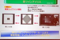 新ツインアイリスは、モード連動のレンズアイリスとシーン連動のランプアイリスからなり、新モデルではアイリスの駆動速度を向上したほか、アイリス形状や動作アルゴリズムの改善を行っている。これによりビビッドモ−ド時のコントラスト比は10,000対1を実現している。