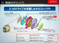 重さは前モデル比で15g増となっているが、Microdriveの重量が13gなので、重さの増加をほぼHDD分だけに抑えている計算になる。一般的に考えると、HDDを搭載するには回路の追加が必要で、その分だけ重さも増えそうなのだが、「従来のDVDカムでも、カメラの記録インターフェース回路にパラレルIDEを採用し、PCのように2ドライブに対応可能にしてありました。このため、大幅な回路変更なしにハイブリッド化を実現できたのです。マスタードライブがHDDで、スレーブドライブがDVDという構成になっています」。